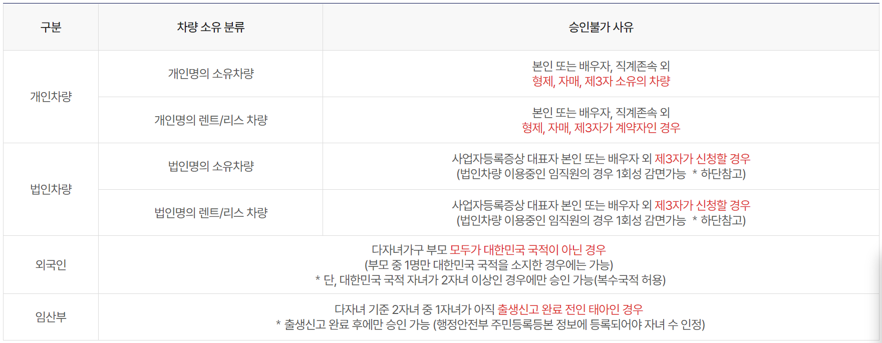 다자녀가구 사전(사후)할인 신청 시 승인불가한 경우