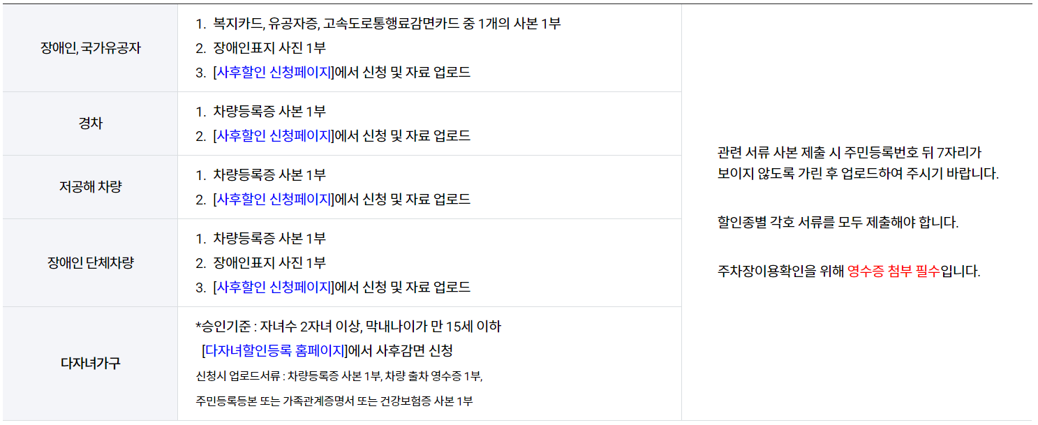 증빙서류 미비로 출차 시 할인을 받지 못한 경우, 사유에 해당하는 관련 서류 일체를 출차 후 30일 이내에 사후할인 신청페이지에 신청 시 출차 기록과 대조하여 할인금액을 환불합니다.