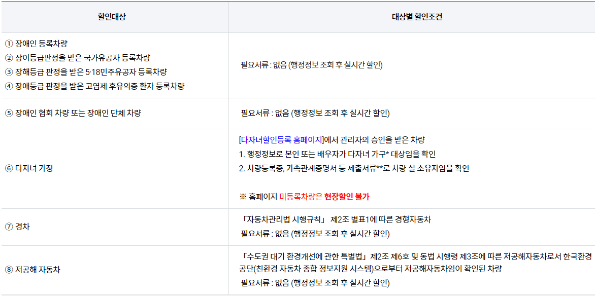 2자녀 이상이면서 막내 자녀가 만 15세 이하인 가구는 다자녀가구 차량등록 완료 시 인천국제공항을 제외한 모든 공항 주차장에서 주차비 50% 자동 할인을 받을 수 있습니다. 단, 막내 자녀의 나