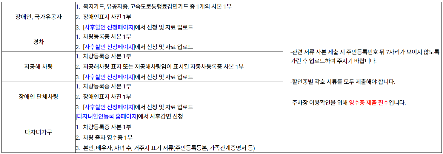 증빙서류 미비로 출차 시 할인을 받지 못한 경우, 사유에 해당하는 관련 서류 일체를 출차 후 30일 이내에 사후할인 신청페이지에 신청 시 출차 기록과 대조하여 할인금액을 환불합니다.