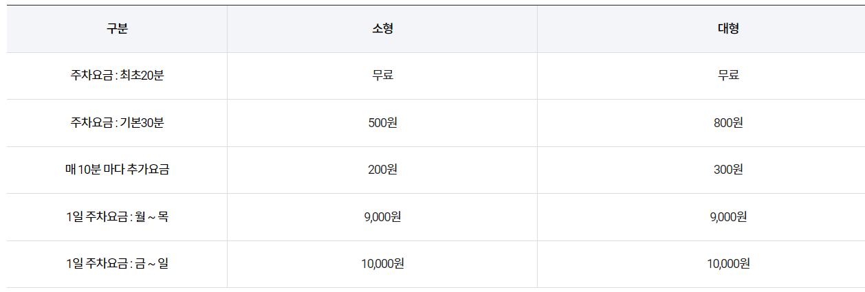 - 입차 후 20분이내 출차 시 주차요금은 무료입니다.