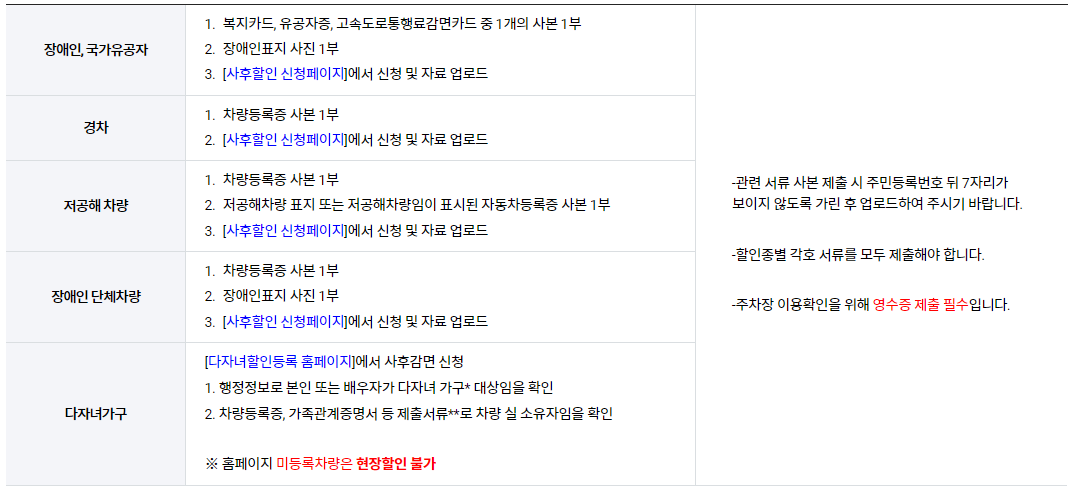증빙서류 미비로 출차 시 할인을 받지 못한 경우, 사유에 해당하는 관련 서류 일체를 출차 후 30일 이내에 사후할인 신청페이지에 신청 시 출차 기록과 대조하여 할인금액을 환불합니다.