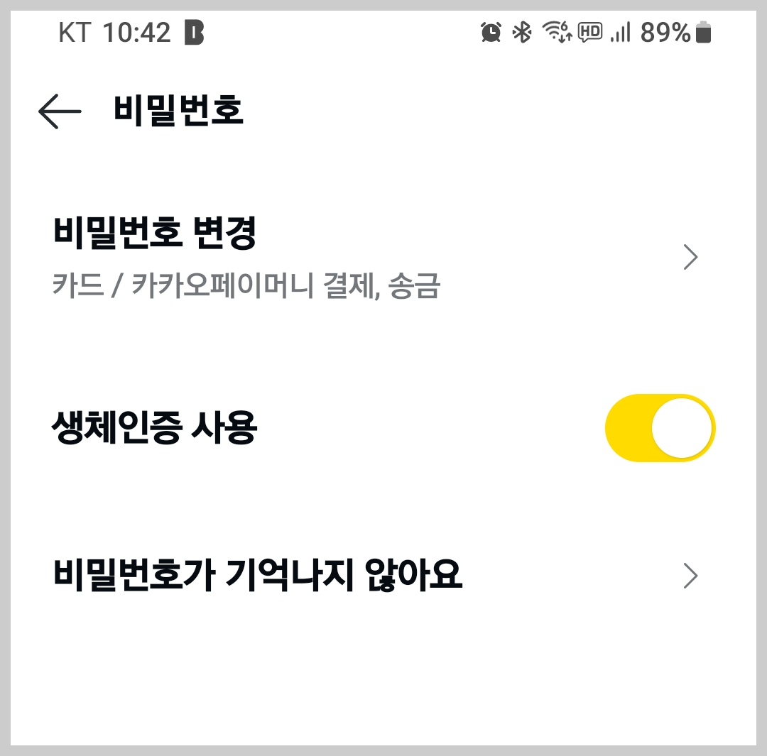 카카오페이 앱 → 오른쪽 상단 삼선(三) → 앱 설정 → 비밀번호 → 생체인증 사용 활성화