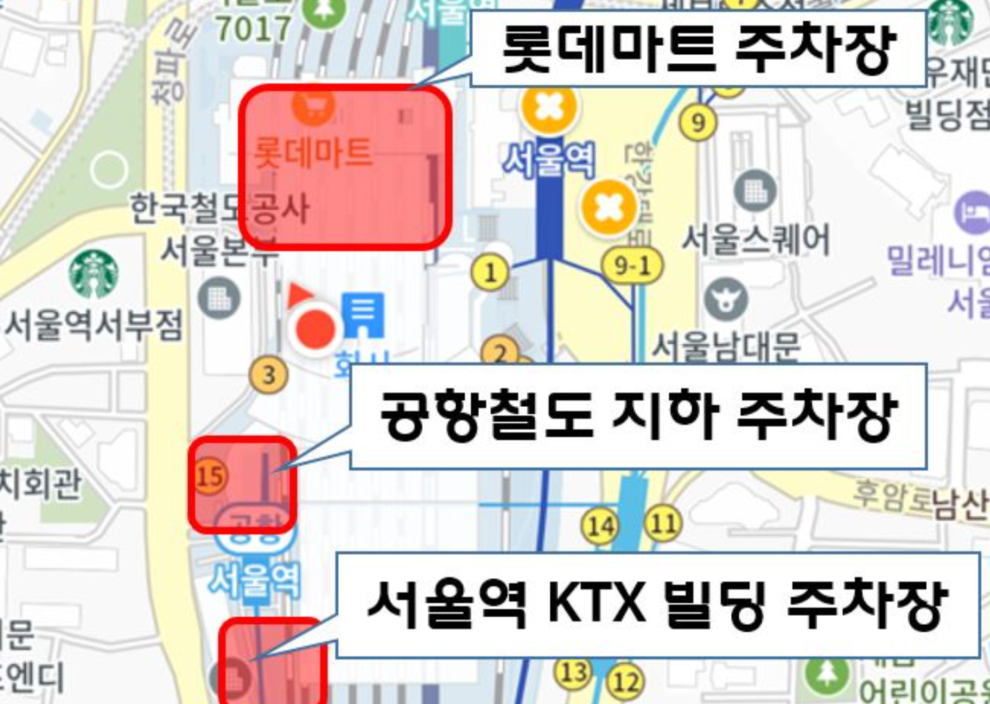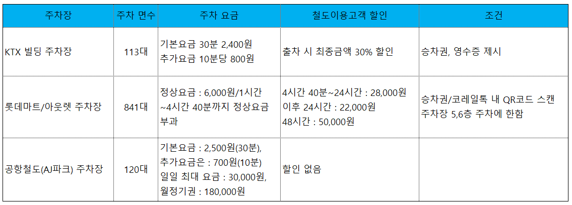 서울역에 주차할 수 있는 주차장은 3곳이며, KTX 빌딩 주차장, 롯데마트/아웃렛 주차장, 공항철도(AJ파크) 주차장이 있습니다.