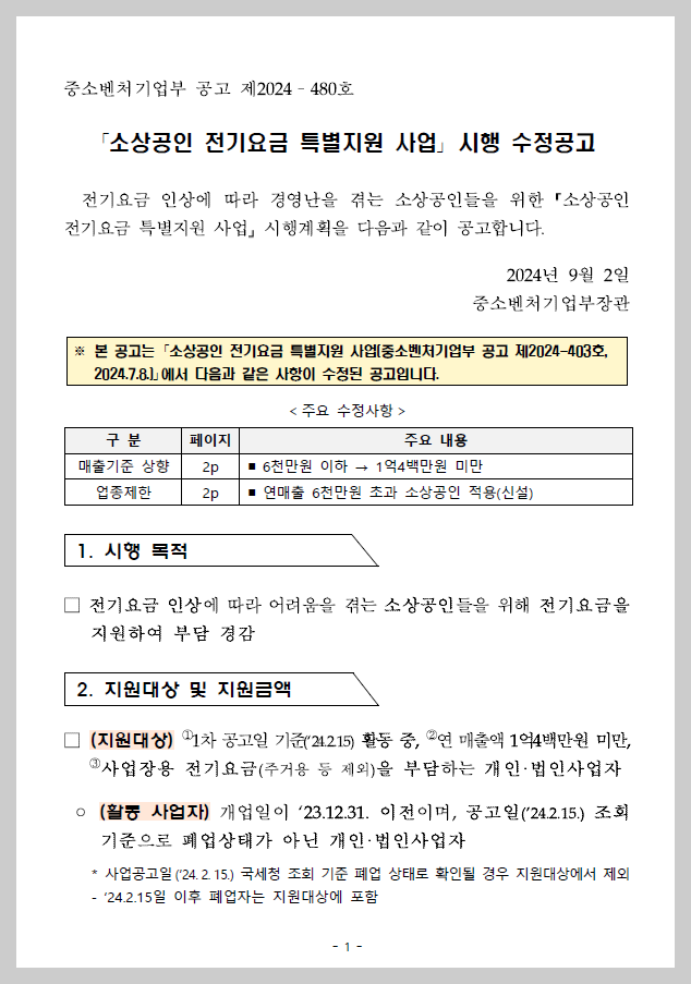 소상공인 전기요금 특별지원 중소벤처기업부 공고문(2024.9.2일자).pdf
