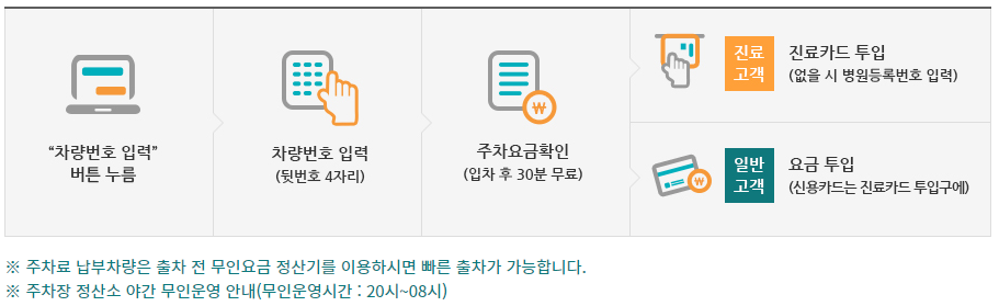 진료고객은 차량번호를 미리 등록하시면 입, 출차 시 편리합니다.